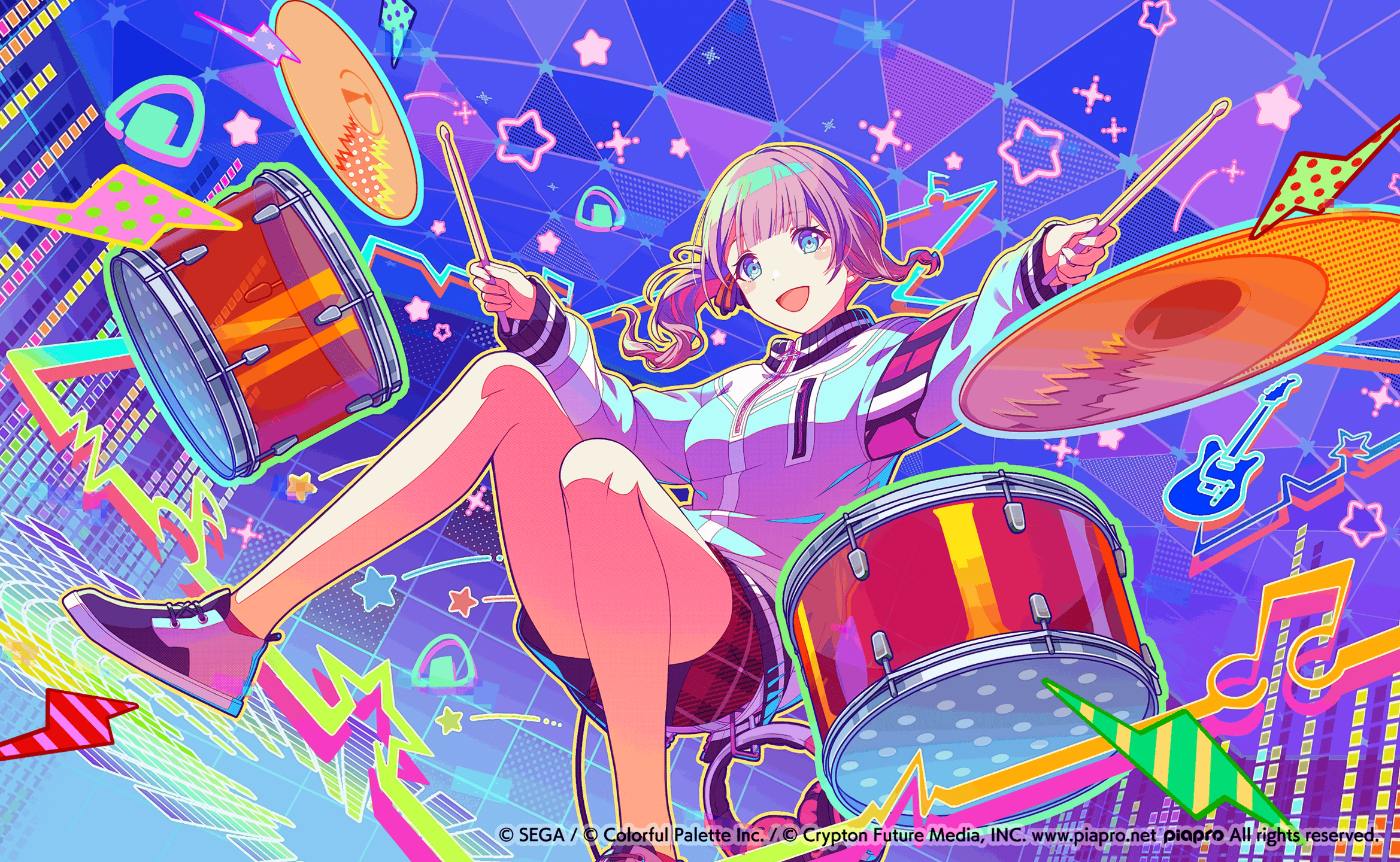 在未來周圍,放置了LN的樂器和均衡器來表達正在練習的感覺。仔細看背景其實是一個有深度的寬闊空間,但是為了表現出看起來像是大家聚在一起演奏的一體感,特意把這些樂器集中畫在前面。