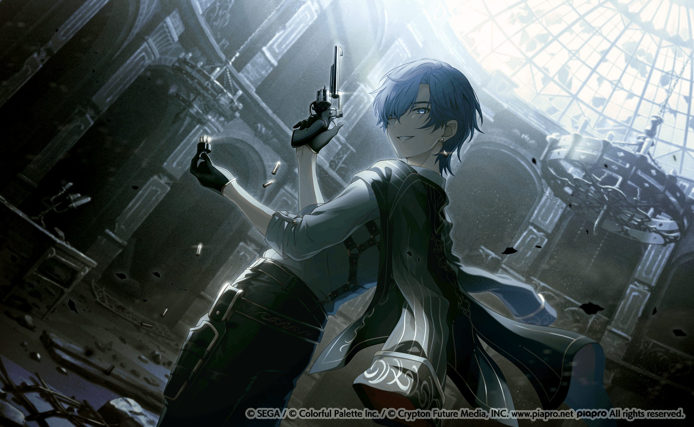 KAITO的插圖中,也想在背景表現出他在戰場上壓倒性的力量和帥氣。透過描繪荒涼的廢墟,讓人聯想到混亂的戰場,同時在天花板上使用彩色玻璃和背光般的光線,營造出神秘的印象。