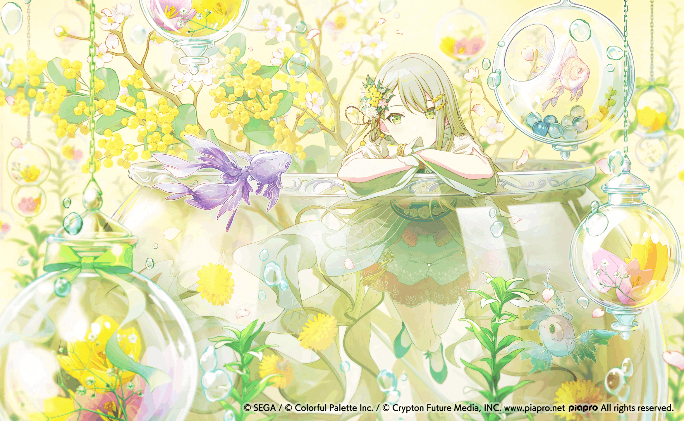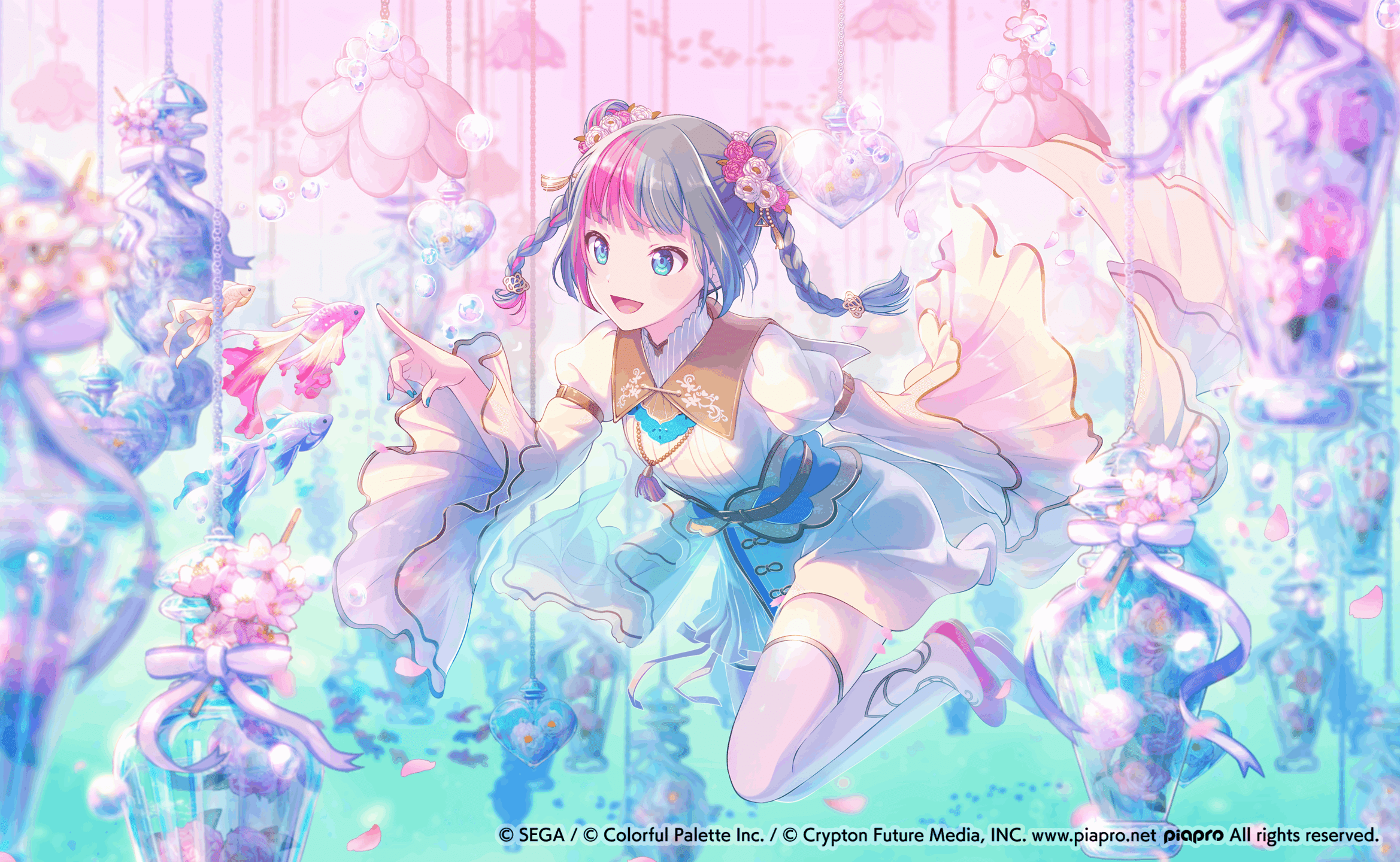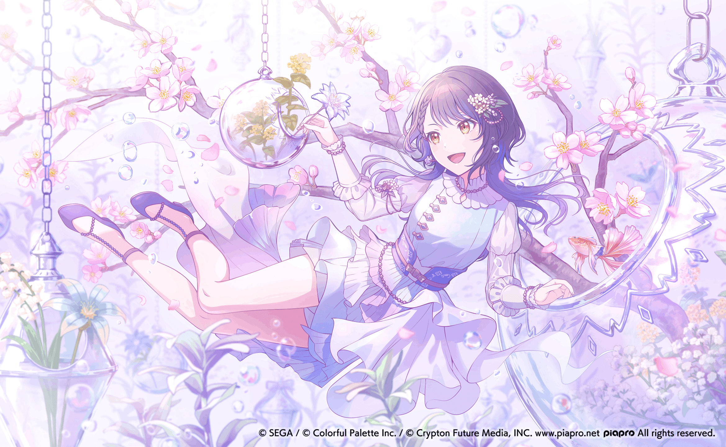 這次希望大家能品味到春天的溫暖和愉快氛圍,所以繪製了春花紛飛、淡彩配色的背景。同時還配合角色的姿勢,在繪製背景時特地凸顯水中才有的漂浮感。