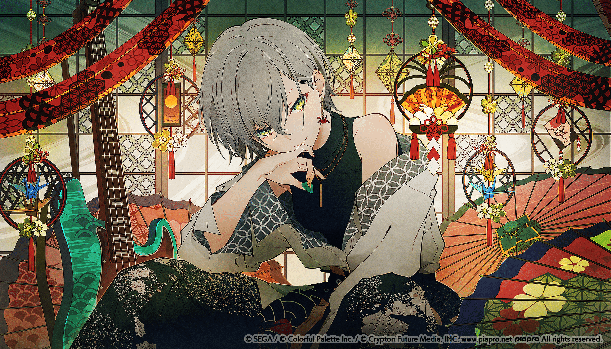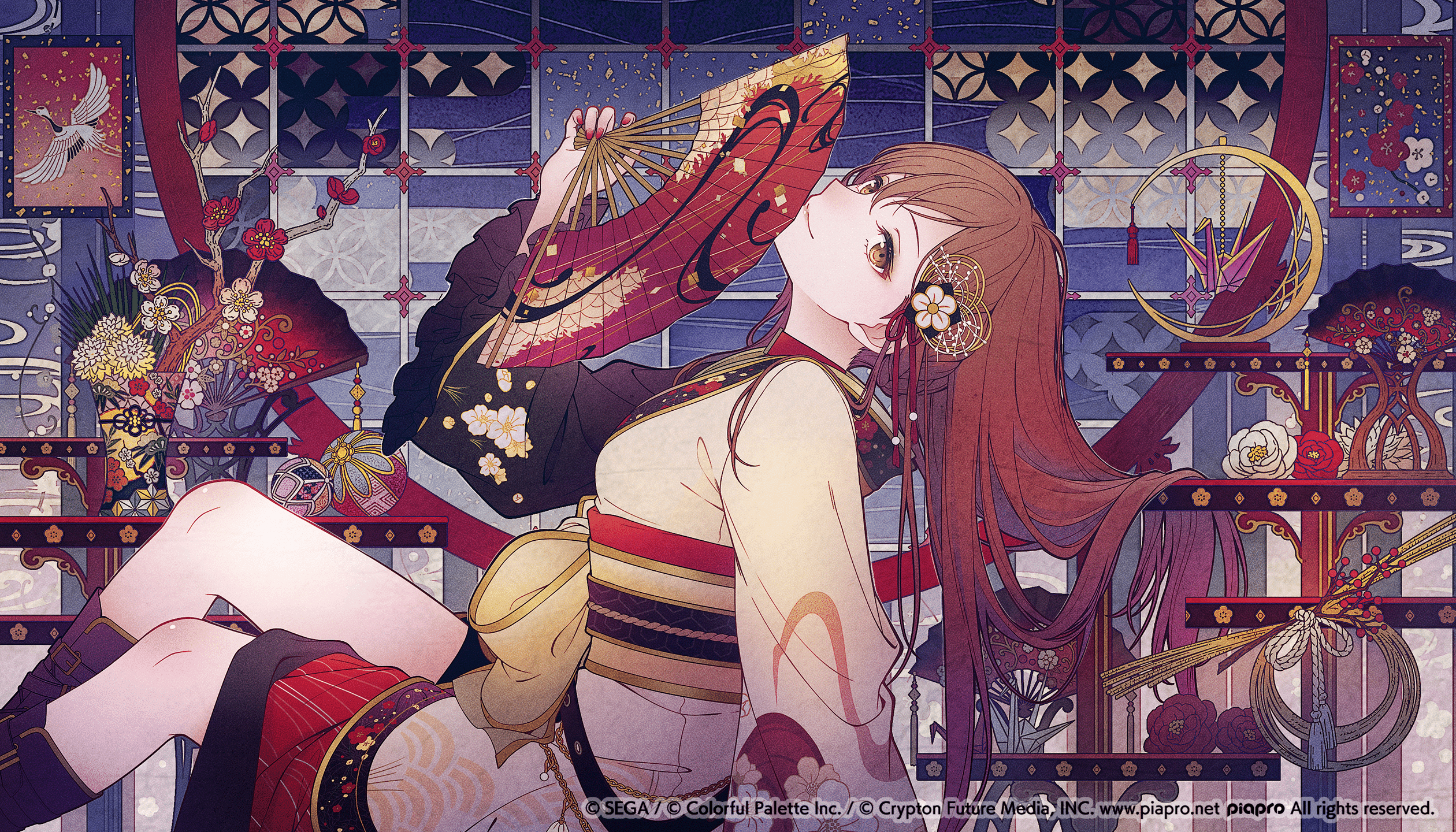 MEIKO的背景像星星一樣散佈著金粉、和紋,也將拉門染成青色,看起來就像夜空一般。為了能襯托出艷麗的姿態和頭髮美麗的輪廓,稍微摸索了物品的配置。背後大型拉門窗戶是使用圓形窗,形狀是想營造出溫柔、惹人憐愛的女性之美而仔細繪製的。