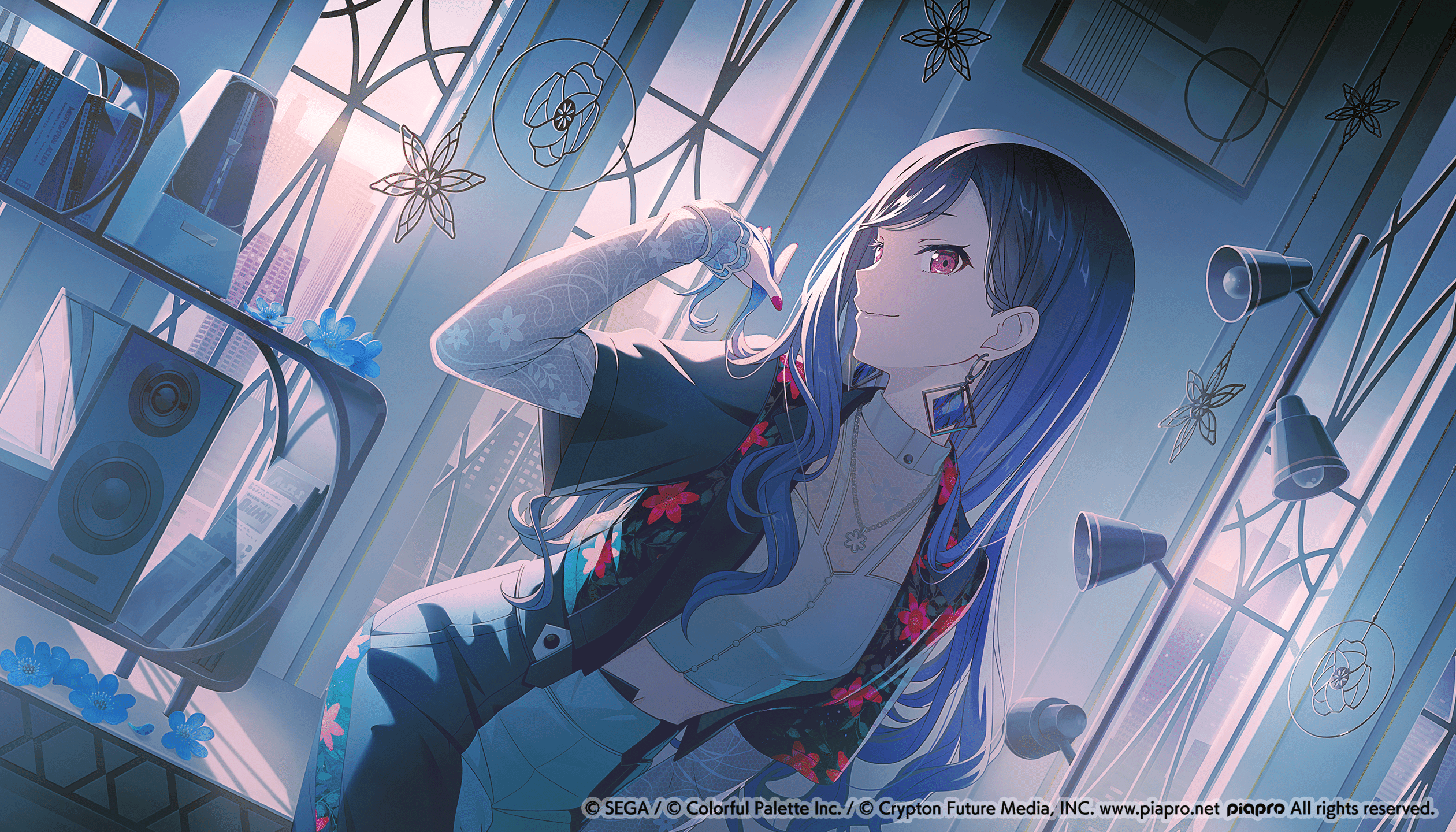 這次插圖首先是以活動主要角色冬彌的插圖意象為首。冬彌的插圖中「鋼琴」是重要元素之一,因此,我們旨在創造一個能夠突出這一元素,並搭配活動實裝樂曲氣氛,時髦而藝術性的空間。
