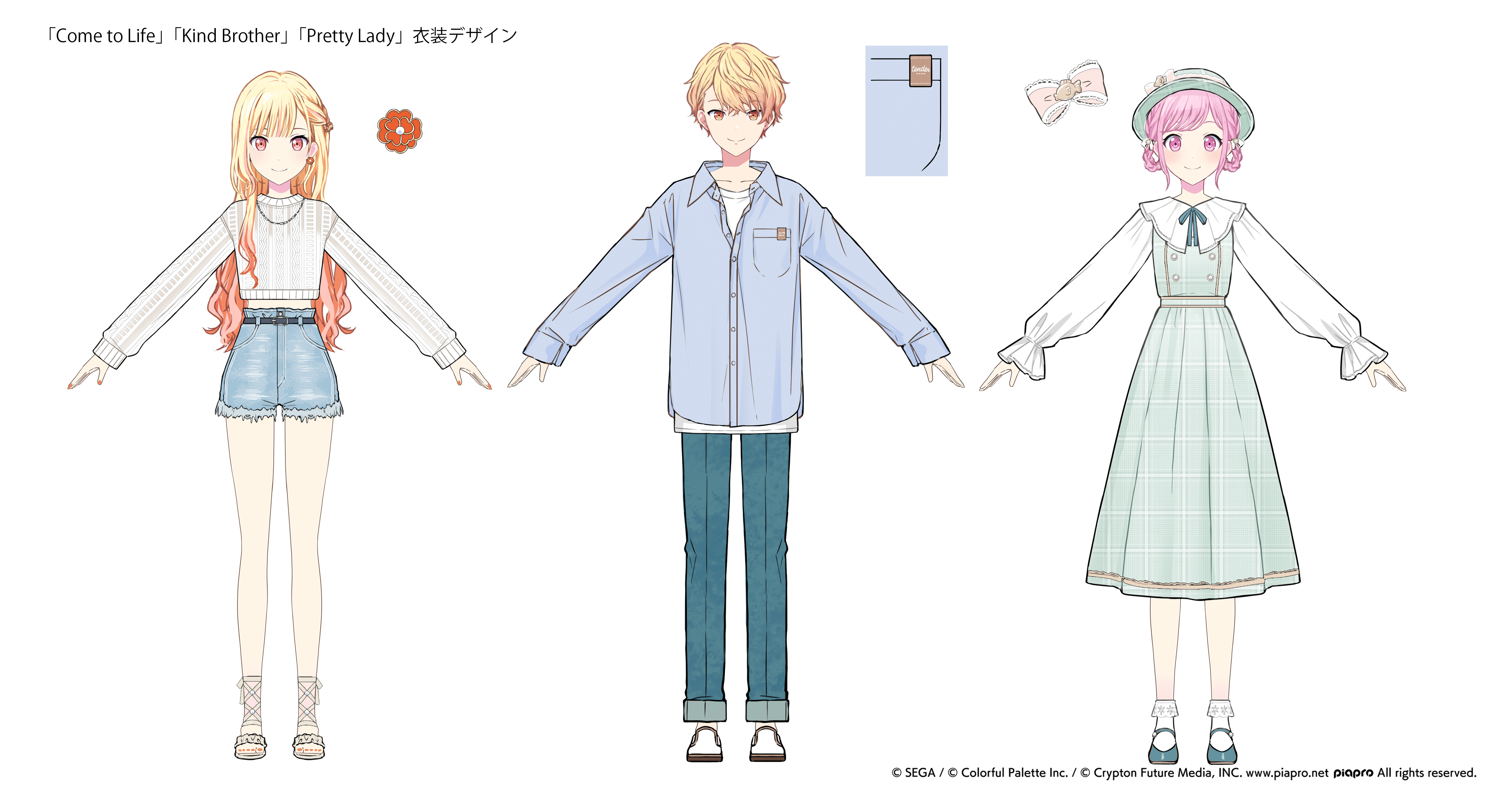 這次Color Festival 招募的插圖,如前所述,每個插畫的情境和氛圍都已經定案了。因此,服裝設計也是尋求能夠突出這些氛圍的風格。將私服設計成適合各角色的服裝同時,也讓他們的心情和個性稍微反映在衣服上。