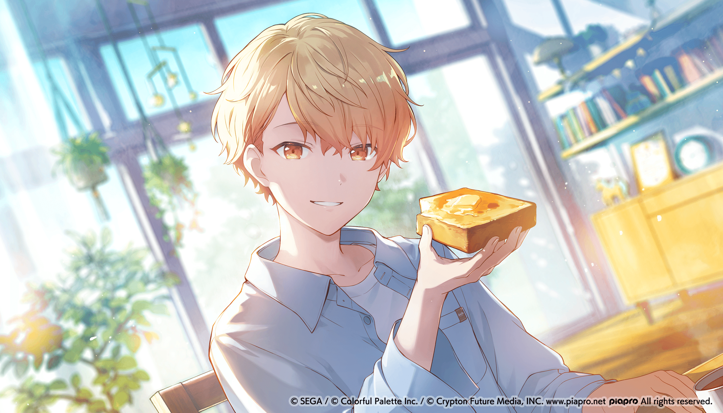 司的背景想表現出陽光充足的清晨和清爽的空氣感,因此描繪了一個有大片落地窗、光線從窗戶灑入的飯廳。用水彩風格表現周圍環境,帶來平和的感覺,同時也讓視線自然地聚焦在司身上。注意到他周圍的架子上排列的自然系物品,可能會發現一些對司具有特別意義的收藏。