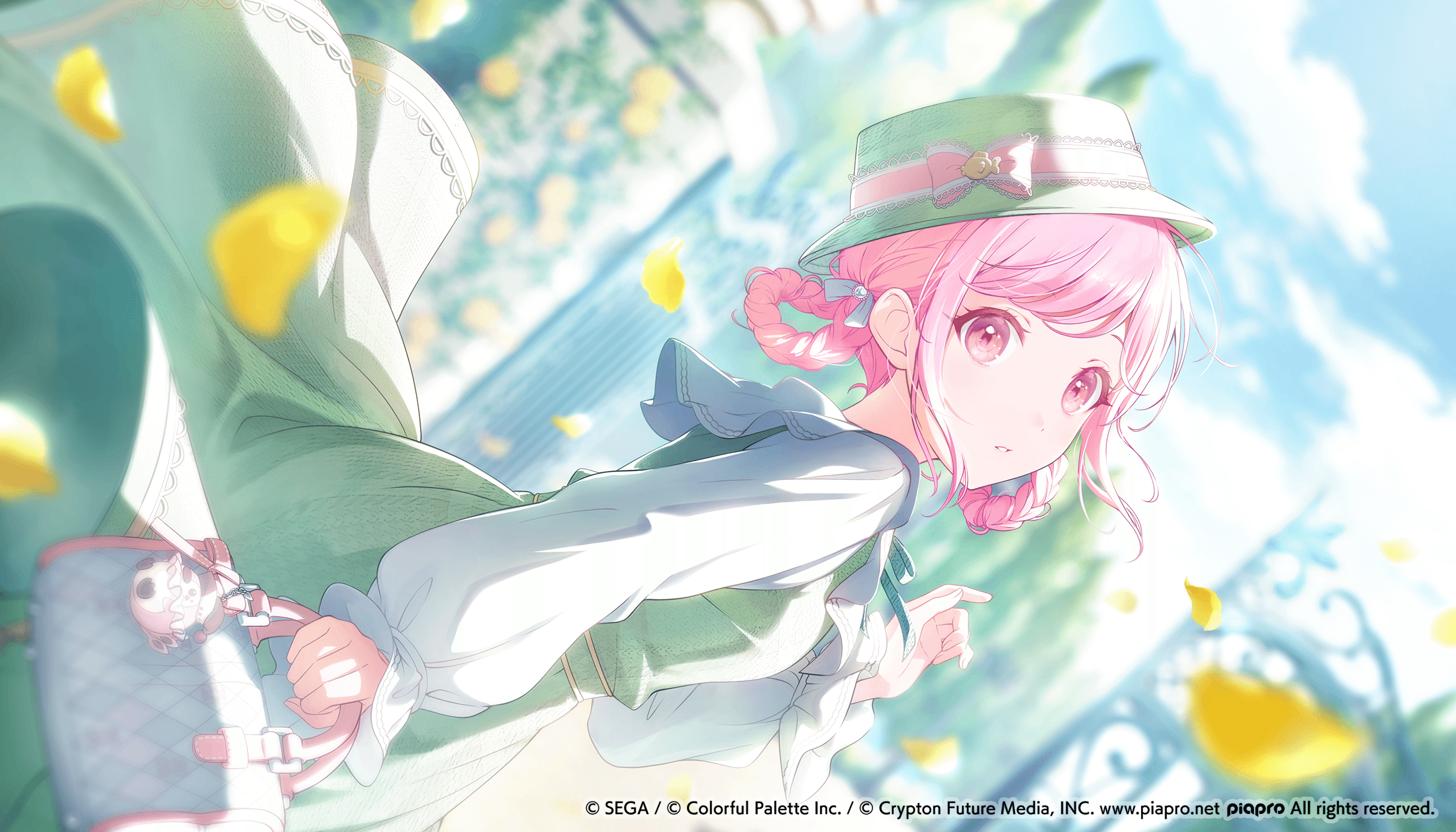 えむ則是希望設計出一種可愛的服裝,因此選擇了高雅的連衣裙風格。為了配合插圖的溫柔氛圍,使用了以淡粉綠為基調的柔和色彩和觸感柔軟的材質。蓬鬆的微捲瀏海和仔細梳妝的髮型,演繹出一位淑女的優雅氣質。