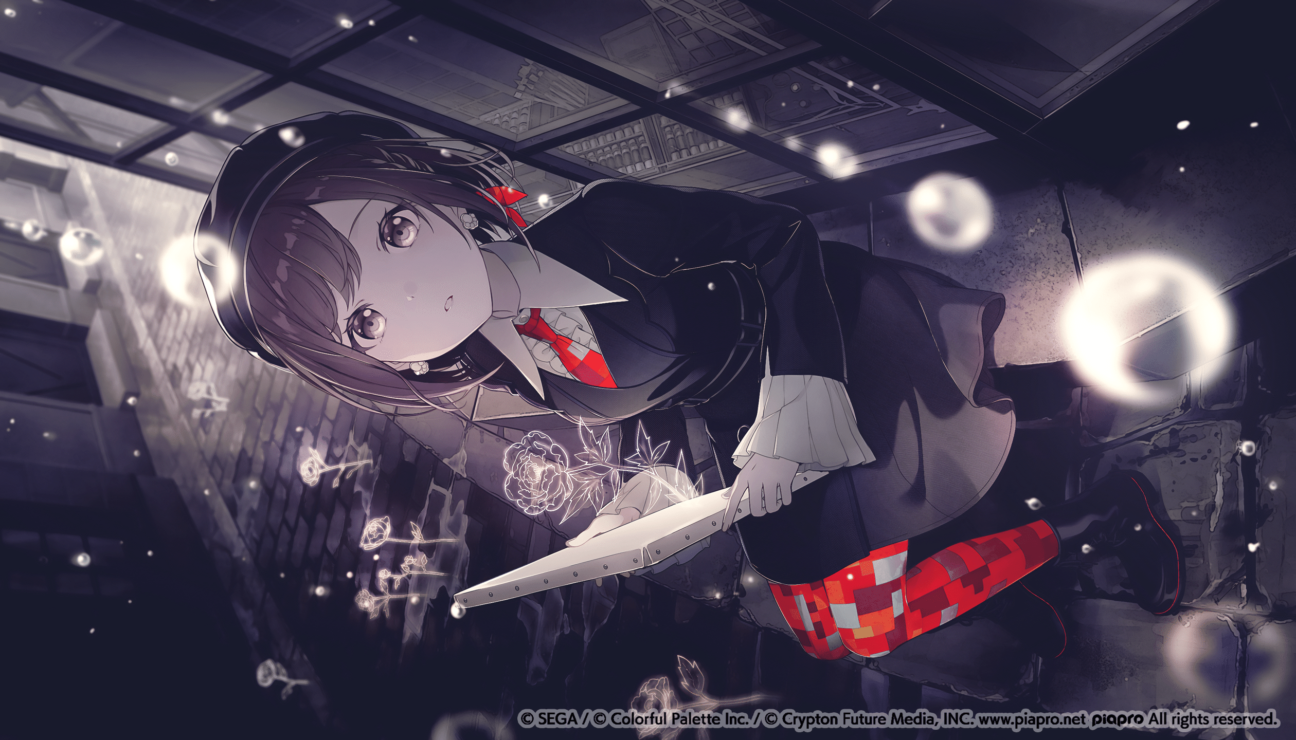 まふゆ的背景描繪了橋對岸燈火輝煌的美麗街景,用厚塗的方式使整體呈現風景畫般的效果。雖然用深色調來增加畫面的沉重感,但和牡丹和水仙花的明亮光芒交會,營造出靜謐而夢幻的空氣感。雨後的水窪則特別注重其光澤感。