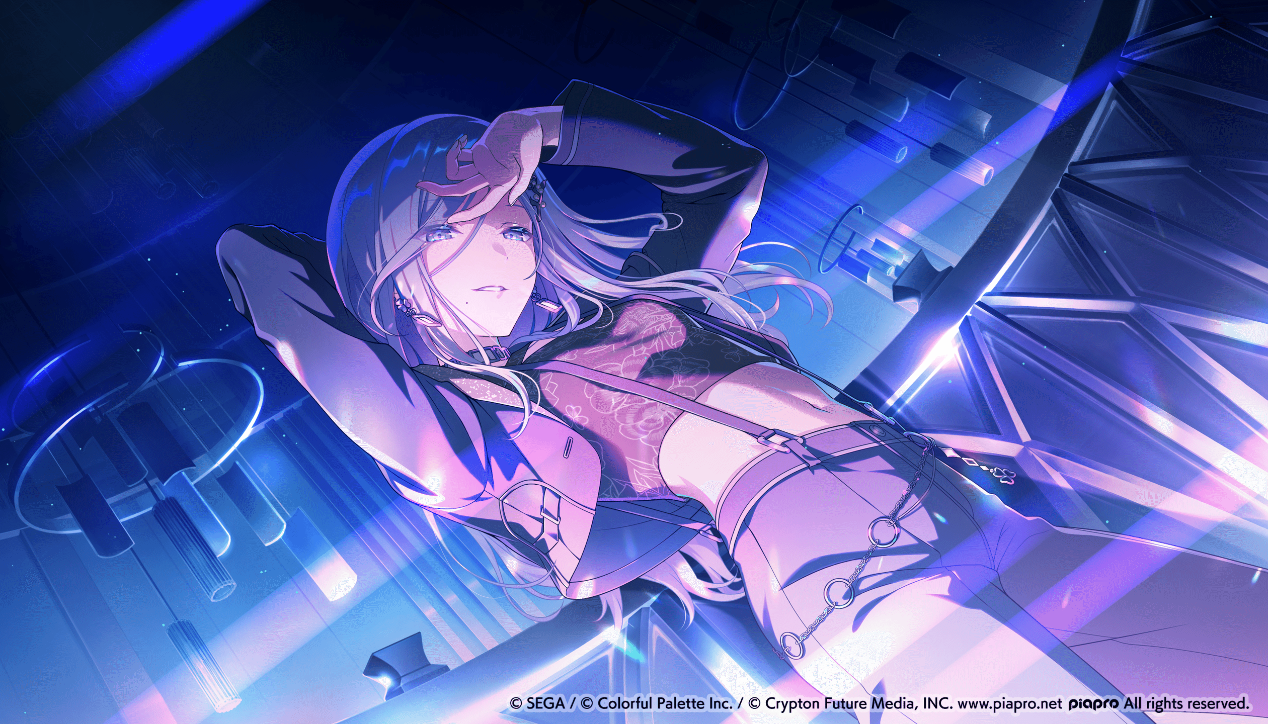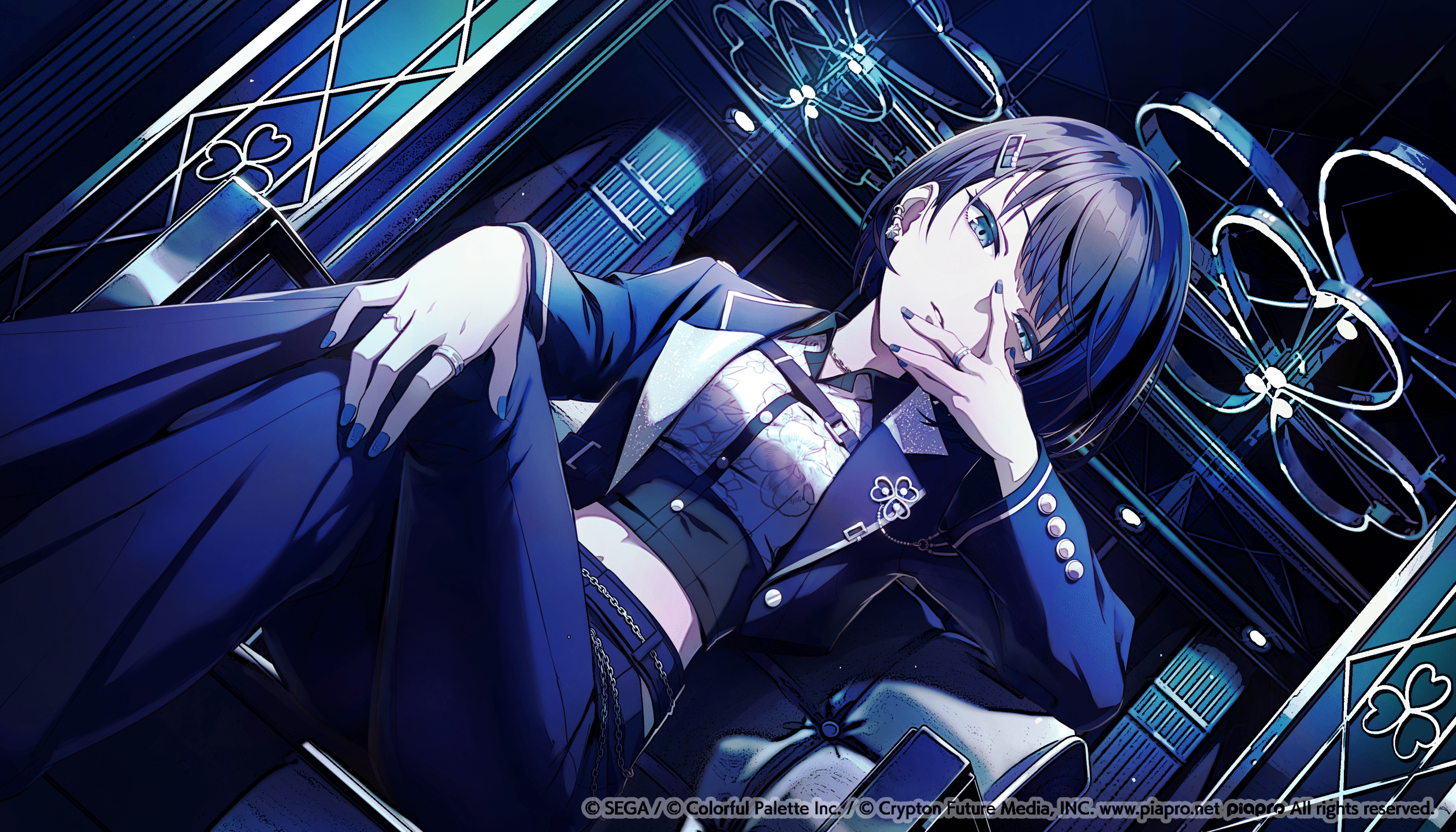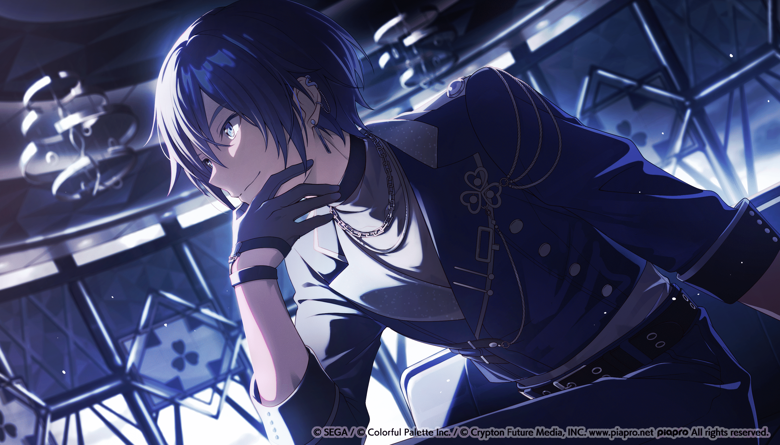 KAITO的背景則是與他的服裝相呼應,展現出成熟且帥氣的印象。我們在背景中融合「帥氣」和「偶像般的光彩」,使用了金屬質感的吊飾和單色的霓虹燈管,這些都是以前MMJ的插圖中較少見的元素。背景中圍繞著KAITO的大玻璃窗,可以眺望外面的廣闊世界,這也許反映了他展望MMJ成員們在未來大展宏圖的心情。